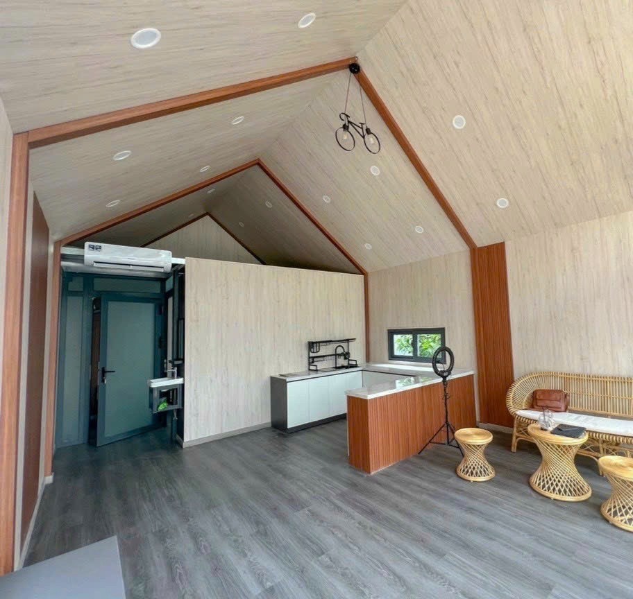 - Màu gỗ trầm ấm và mái kính hoặc mái polycarbonate tạo không gian nghỉ dưỡng.