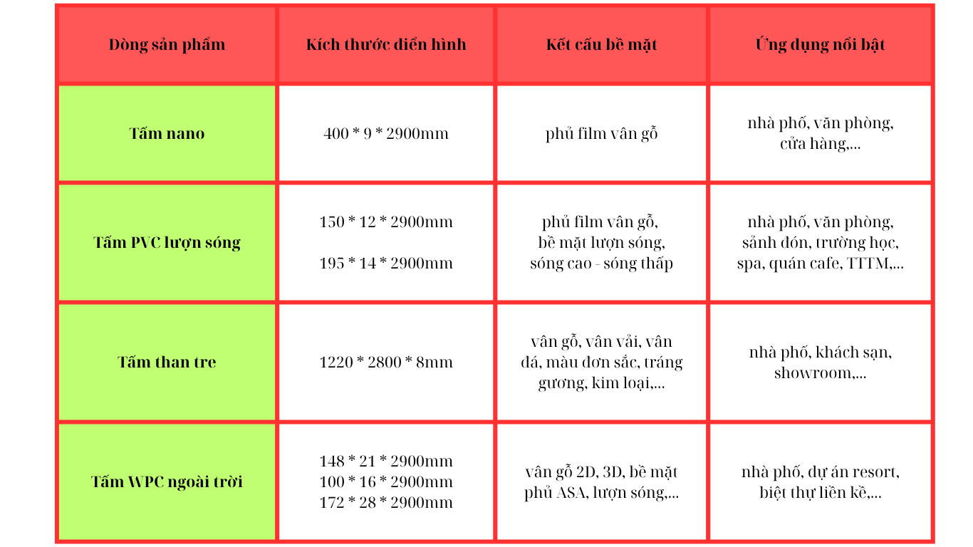 - Hệ khung: Thép hộp mạ kẽm thích hợp cho tấm WPC ngoài trời, hệ khung trần chìm thích hợp cho tấm Nano; PVC lượn sóng trong nhà. Hệ khung thép hộp mạ kẽm chịu lực tốt hơn hệ khung trần chìm.
