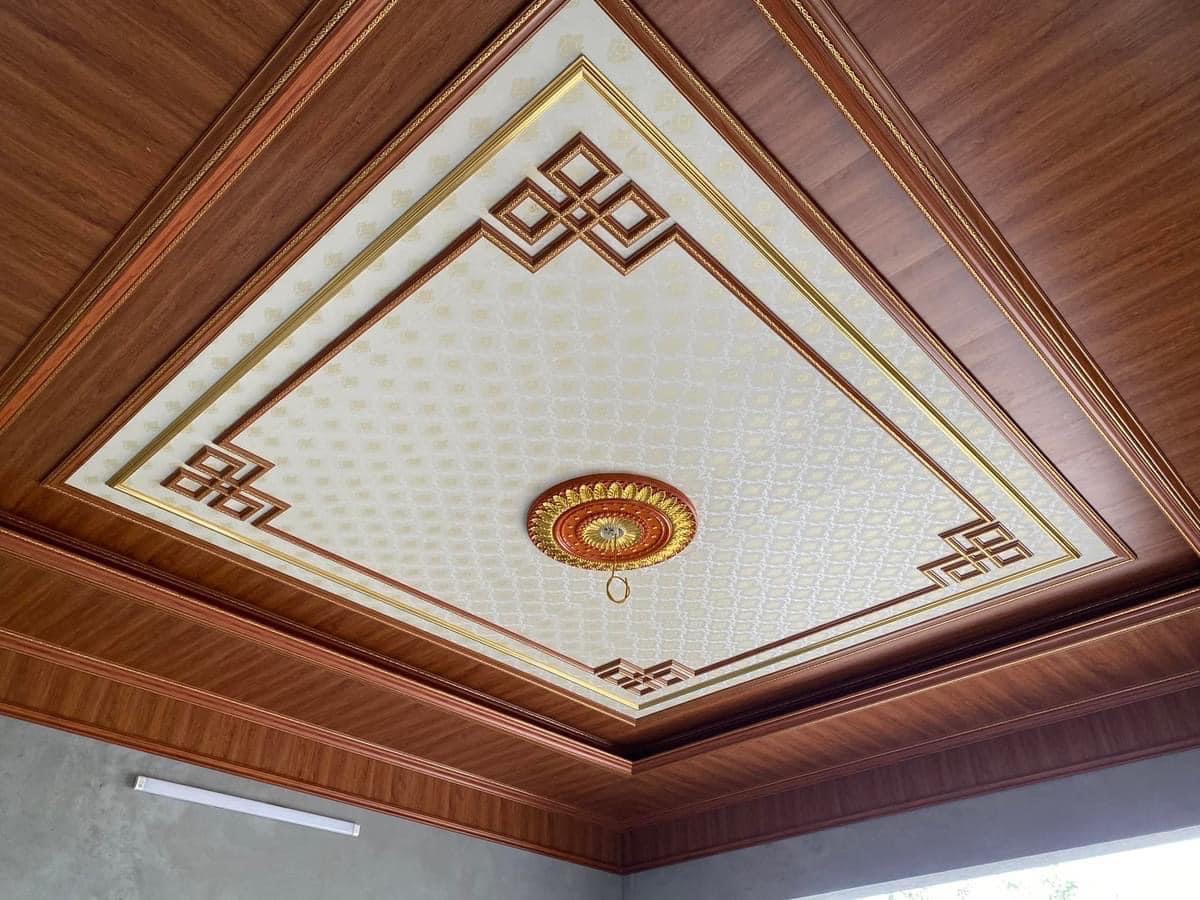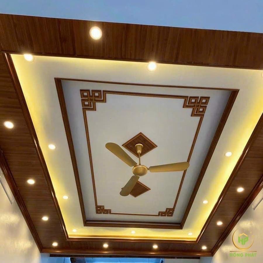 - Thiết kế giật 1–3 cấp kết hợp lam sóng hoặc Nano phẳng với đèn LED âm/khe hắt tạo hiệu ứng ấm cúng, nổi vân gỗ; dùng nhiều cho phòng khách, phòng ngủ, sảnh đón