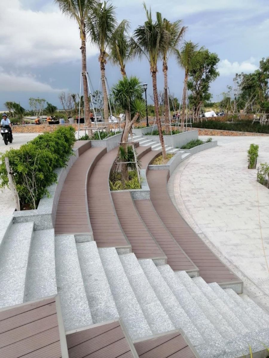 - Tích hợp hệ lam & pergola đồng màu tạo tổng thể thống nhất vật liệu composite.