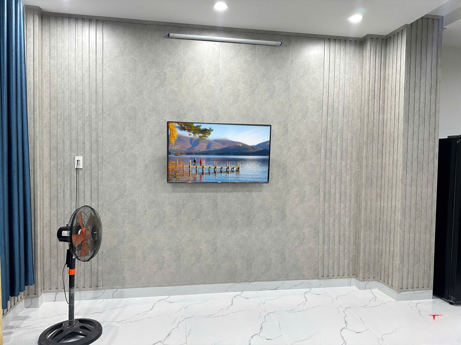 - Ốp vách TV tạo nền sang trọng: vân gỗ trầm hoặc vân đá sáng kết hợp đèn hắt LED khe chỉ.