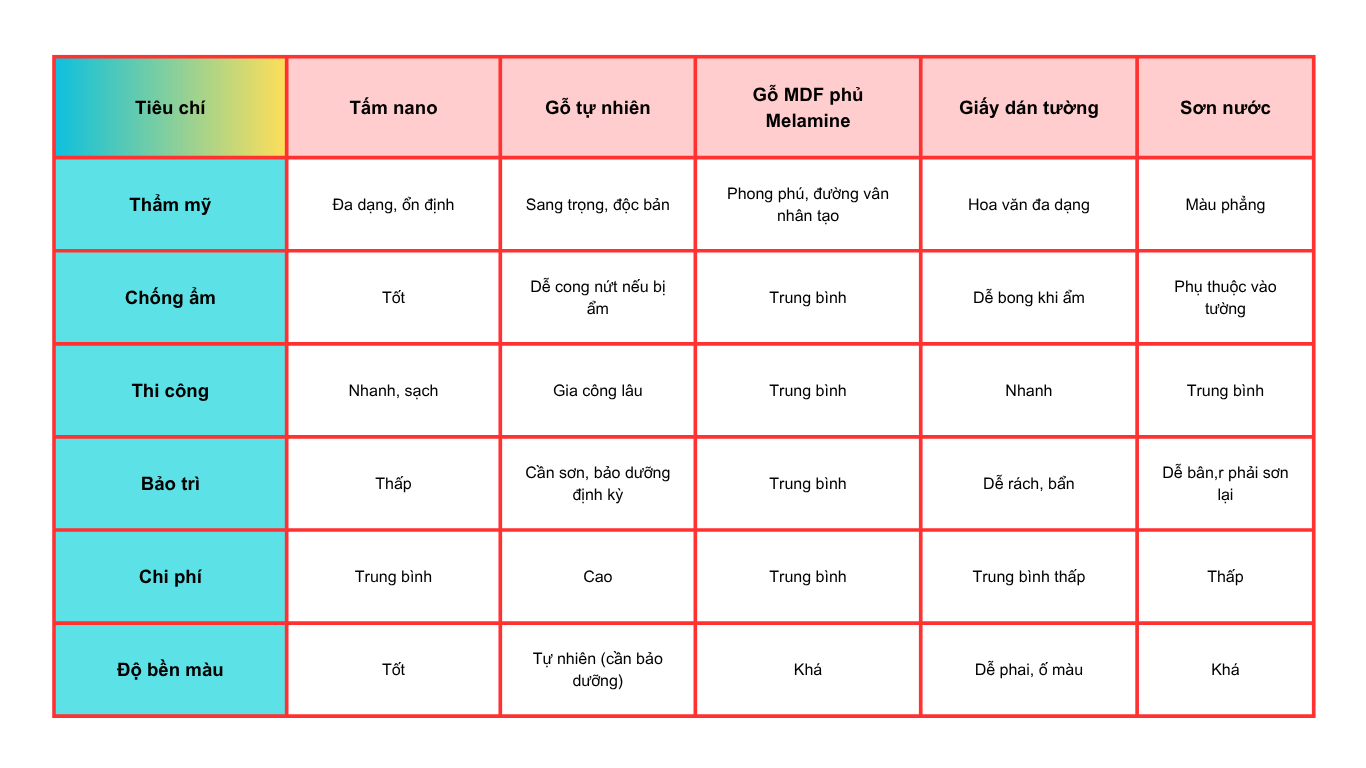 5. So sánh nhanh tấm ốp nano với một số vật liệu nội thất khác