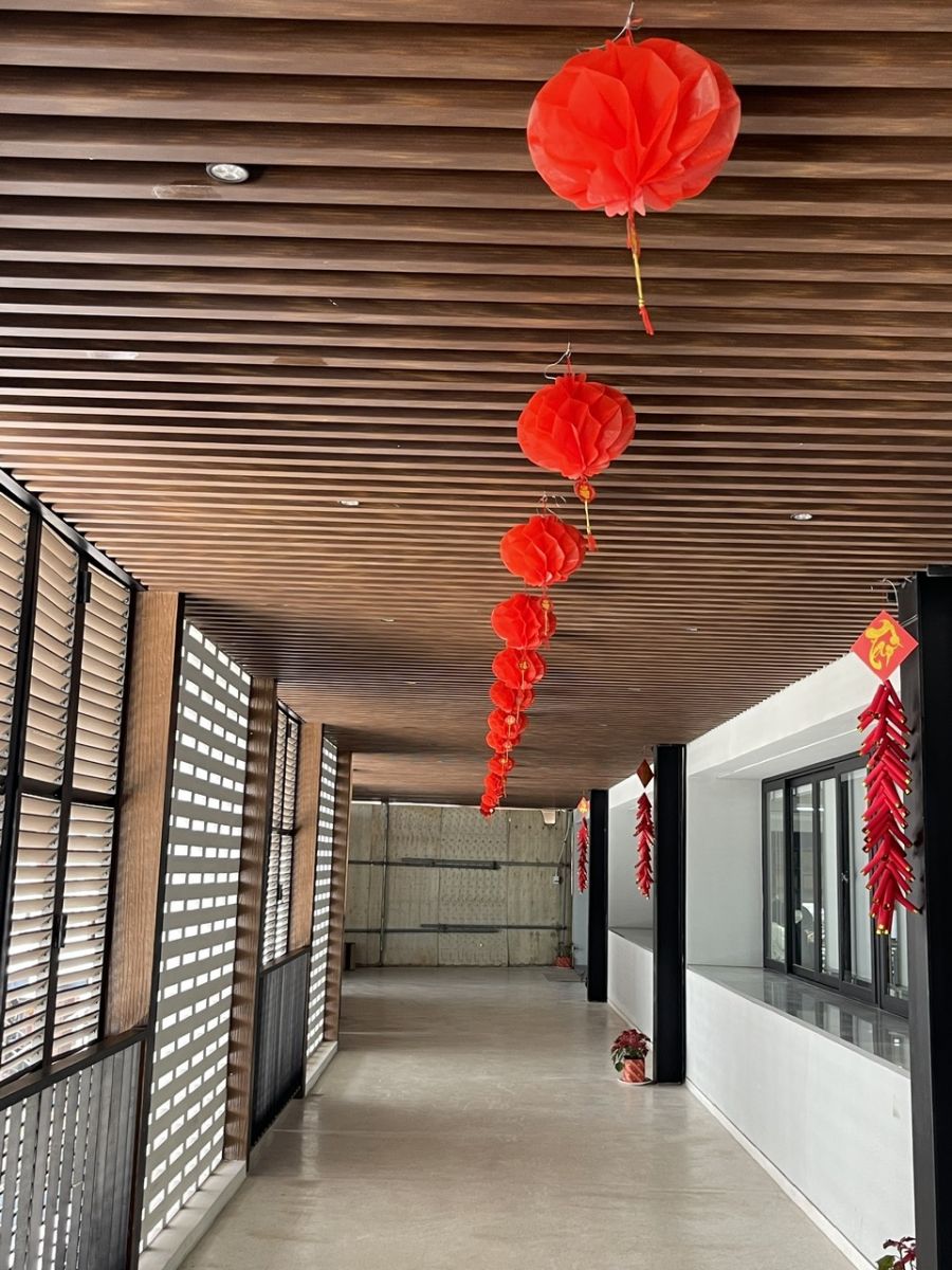 - Bệnh viện – Resort: Sảnh lễ tân, hành lang mở, chòi nghỉ, khu lounge ngoài trời có mái che.